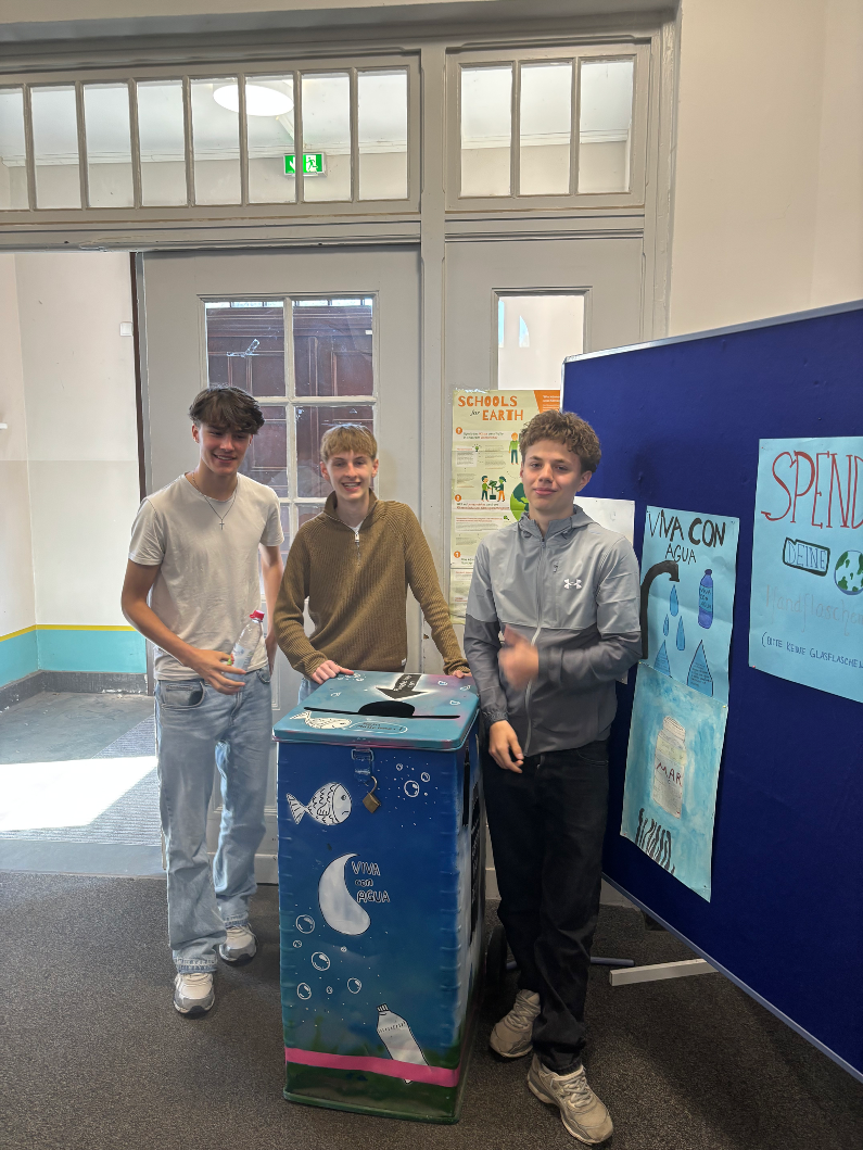 An unserer Schule sammeln wir leere Pfandflaschen in der Viva con Agua-Tonne. Dahinter steckt folgende Idee: Wir sammeln das Pfandgeld und spenden es an Viva con Agua. Wir waren dafür zuständig, die gesammelten Flaschen wegzubringen und das Geld, das wir dafür bekommen haben, geben wir als Spende an Viva con Agua weiter.