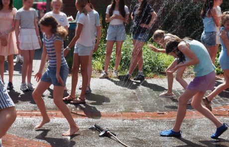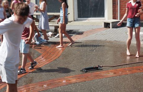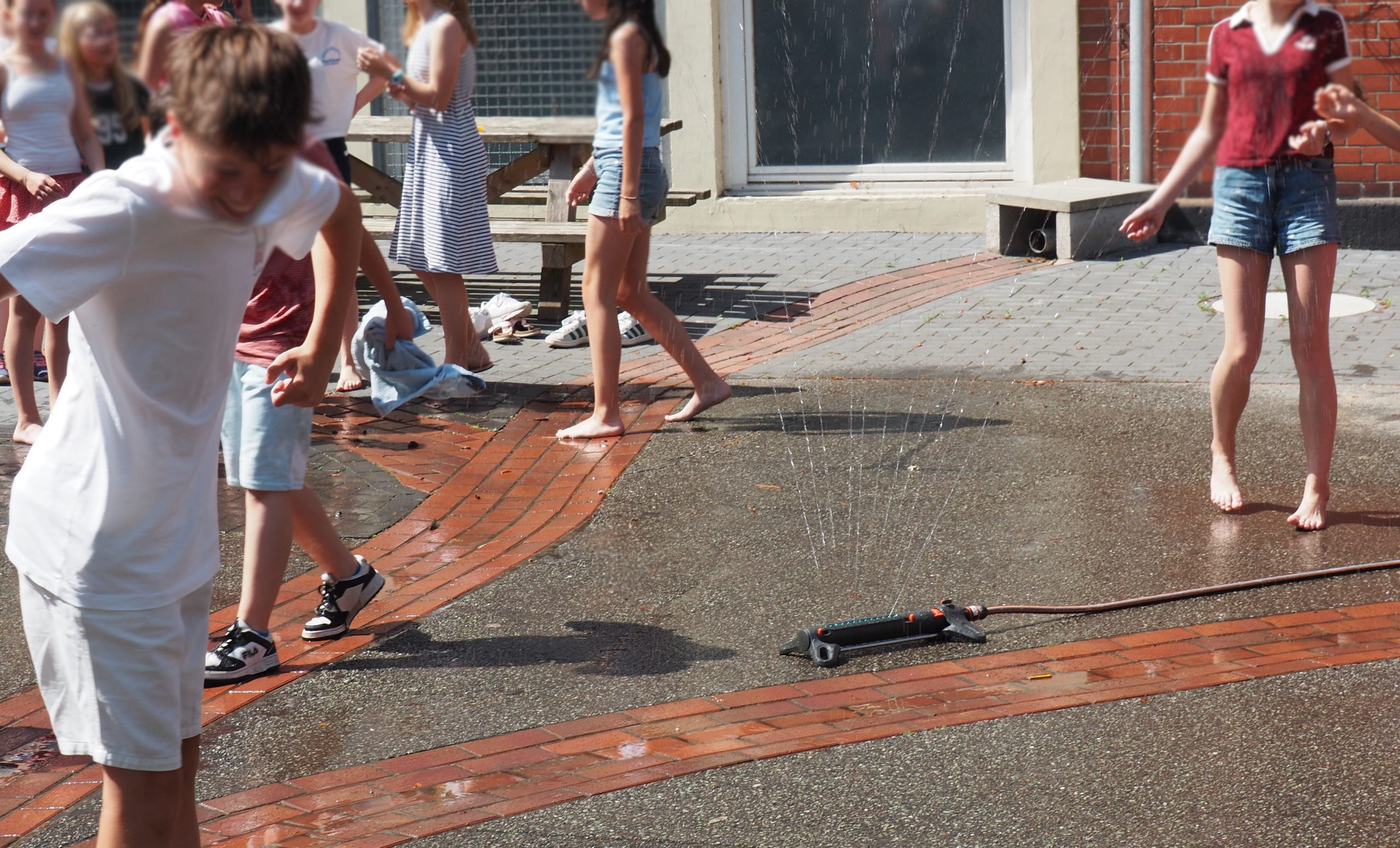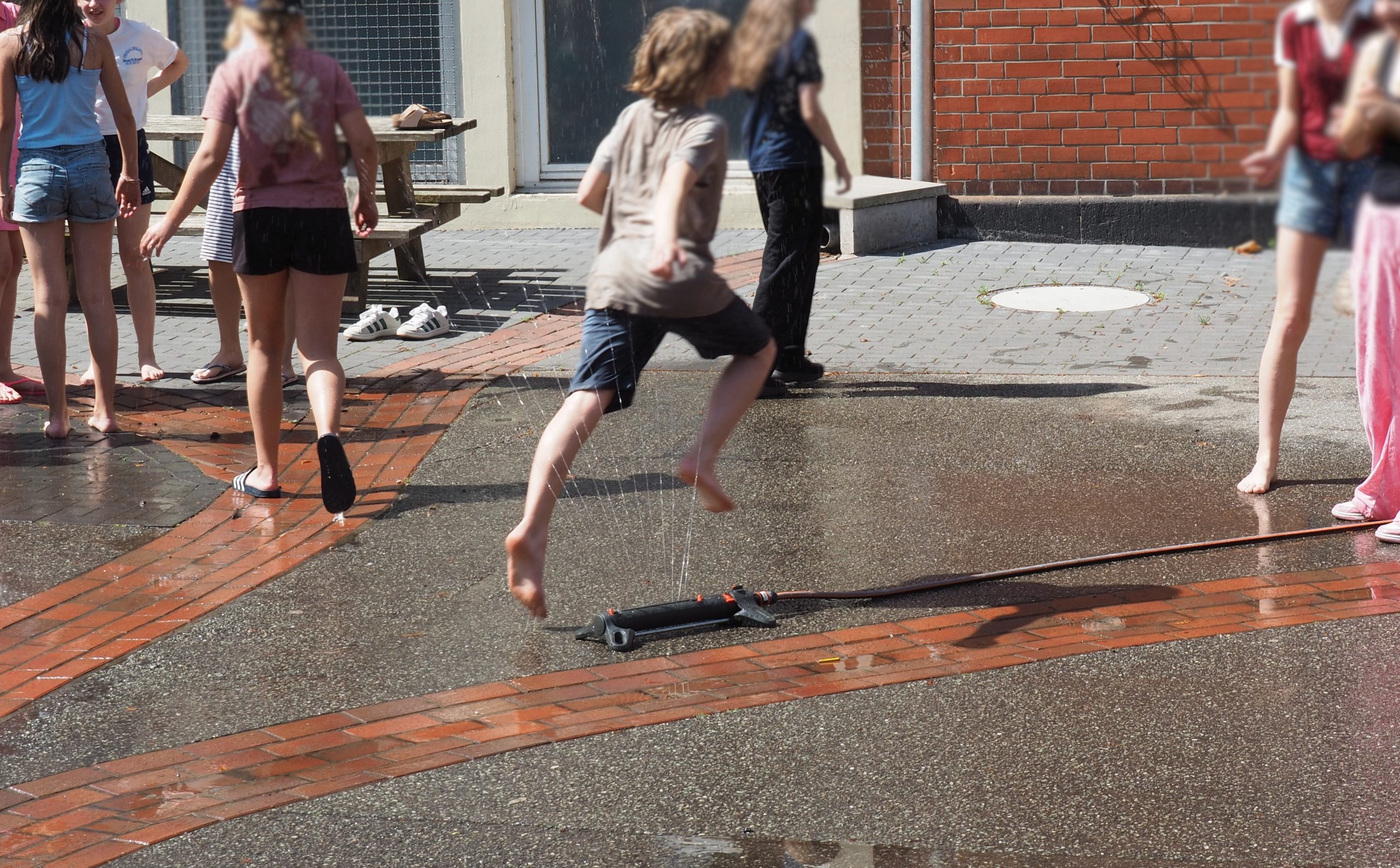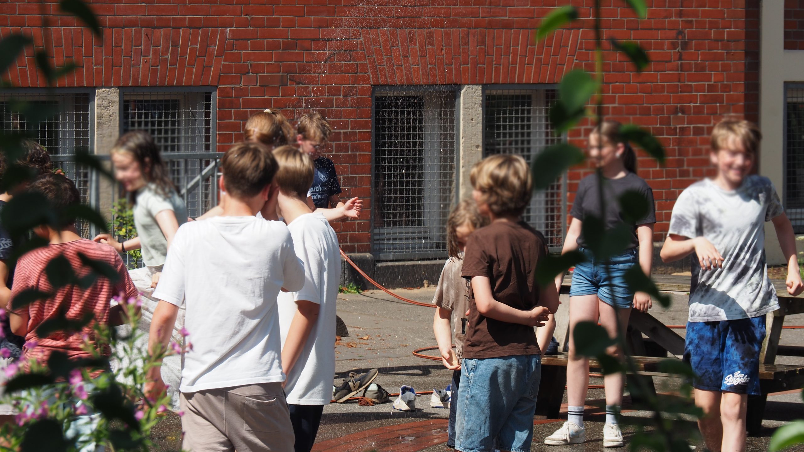 Am bislang heißesten Tag des Jahres sorgten die Hausmeister mit einem Rasensprenger für willkommene Abkühlung auf dem Schulhof.