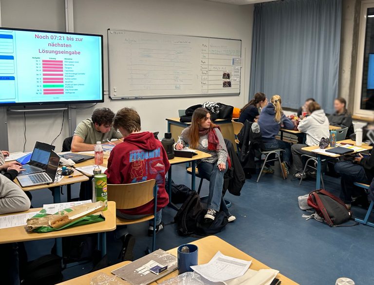 Es war wieder einmal eine ganz besondere Nacht! Das Haus D ist hell beleuchtet, SuS gehen auf und ab und Mathelehrer*innen laufen umher. Von Freitag 17 Uhr bis Samstagmorgen raucht der Kopf. Die Stimmung ist grandios, die meisten laufen in bequemen Klamotten, witzigen Pyjamas oder roten Crocs rum🙂. Es wimmelt von Süßigkeiten, Chips, Brezeln und Matheschnipseln überall.
