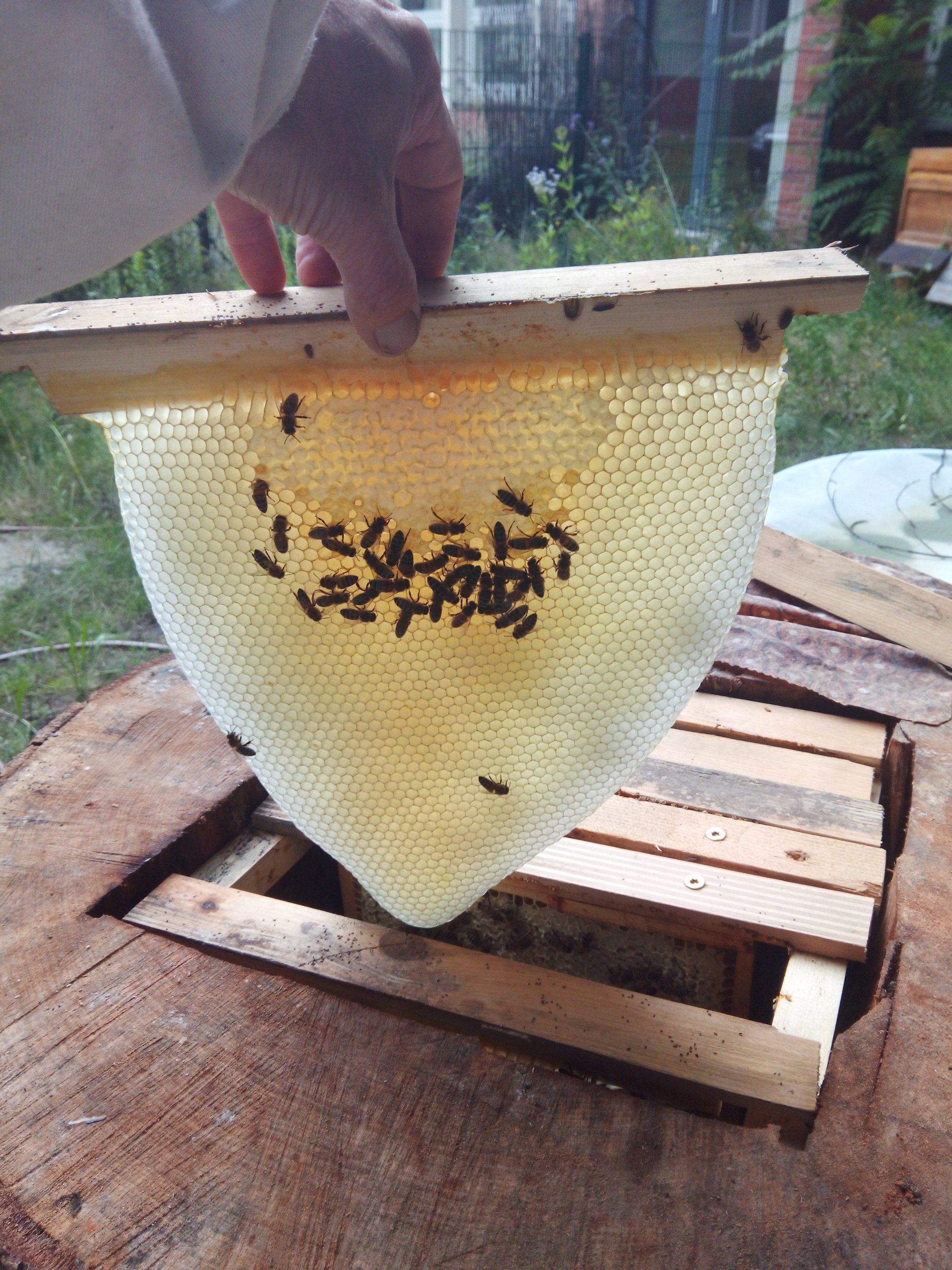 Die Bienenbehausung wurde mit einer schadstofffreien Lasur überzogen. Der Deckel ist mit einer wasserdichten EPDM- Folie abgedeckt. Im unteren Bereich der Behausung ist ein Einflugloch gebohrt worden. Damit haben die Bienen zwischen dem Wabenbau direkt unter dem Deckel und dem Einflugloch viel „Trommelraum“. Dieser Raum wird von den Bienen verwendet, um im wahrsten Sinne des Wortes „abzuhängen“ oder auch Eindringlinge abzuwehren.