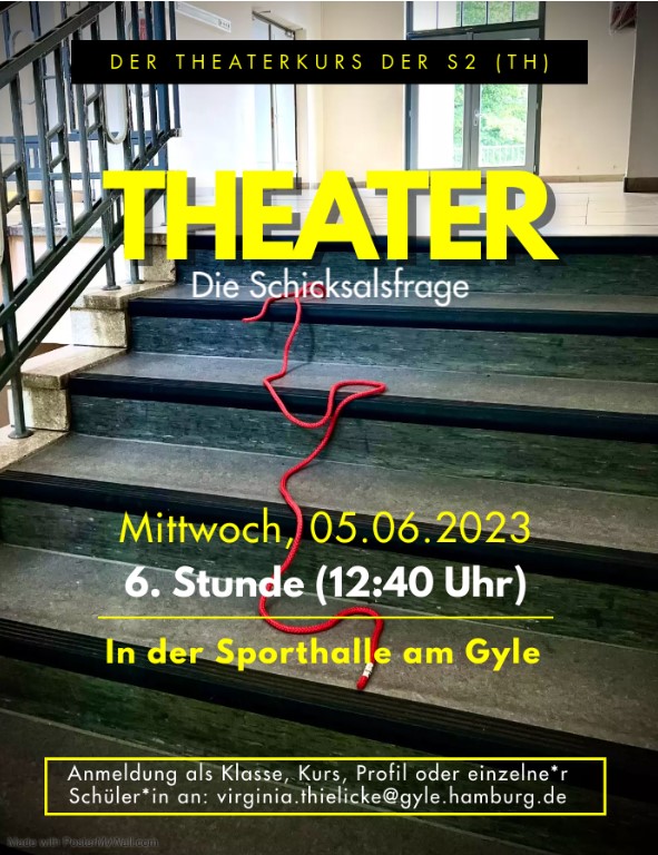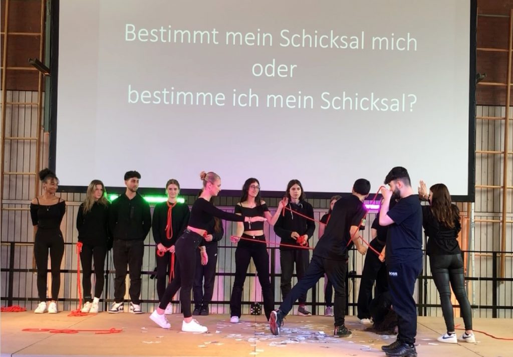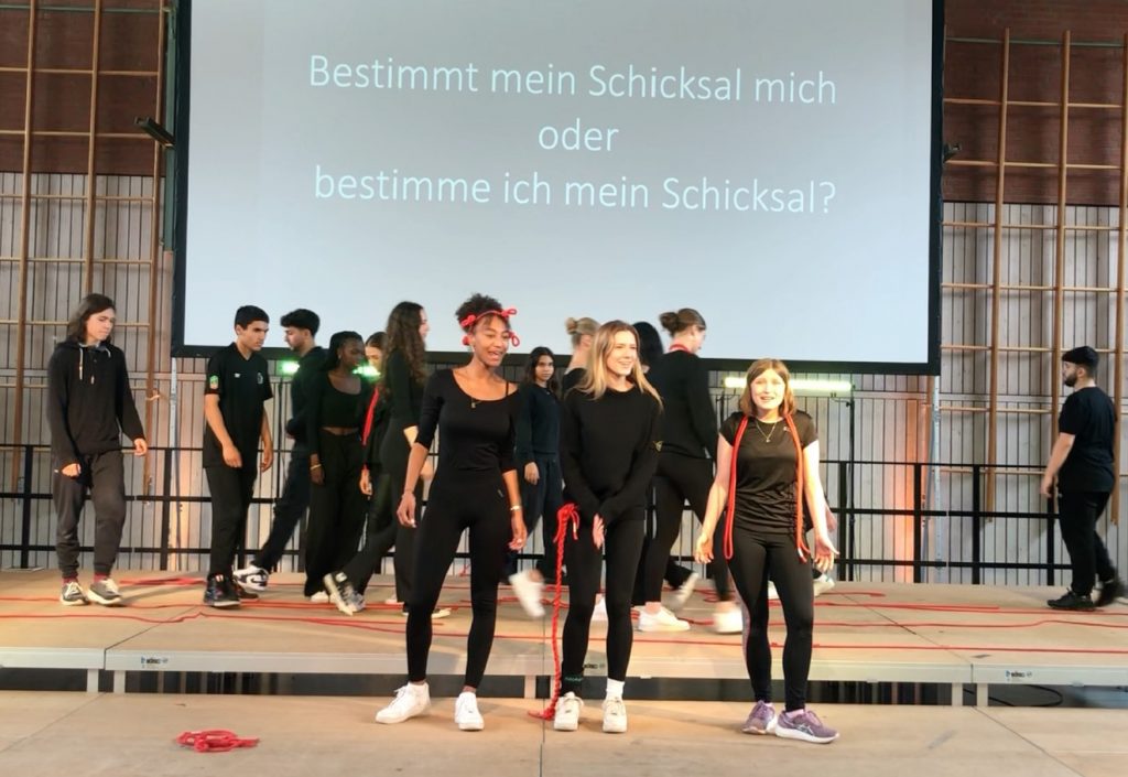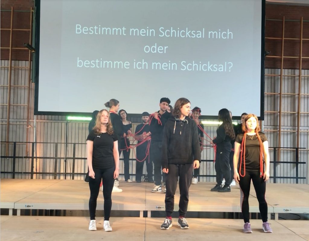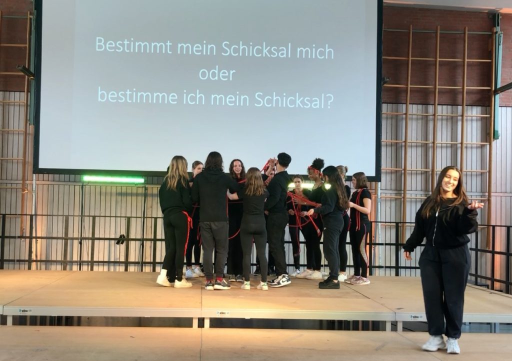 Am Montag, 30.6., zeigten die beiden Wahlpflichtkurse Theater aus dem Jahrgang 9 einige Ergebnisse aus dem diesjährigen Probenprozess. Es war seit Längerem das erste Mal, dass in Jg.9 wieder Theater gewählt werden konnte und trotz widriger Umstände – noch ist die Aula nicht ganz fertig und immer wieder musste räumlich und technsich improvisiert werden – war das Ergebnis beachtlich!